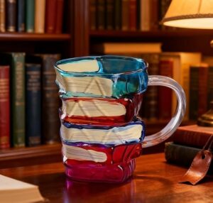 1. Artistic Book Stack Glass Coffee Mug, 11 oz.