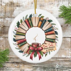 The tag on the book wreath reads, “Dear Santa, Bring Books & Coffee.” What else does any book-loving author need this holiday season?